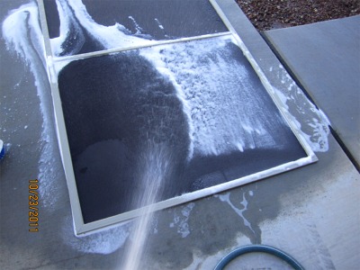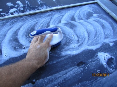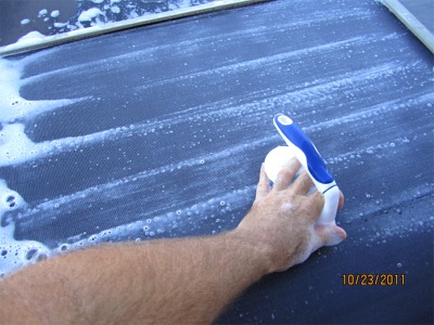 Then repeat the above procedure on the remaining section of the screen. Rinse both sides and flip the screen over and repeat the cleaning procedure on the other side of the screen. Rinse both sides thoroughly when finished and lean the screens against the house to dry: