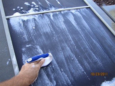 Pick a flat, clean area to clean your screens. I find the driveway works best. Add some water to your bucket and add a decent amount of the dish soap so you have a good sudsy solution. I spray both sides of the screen with the hose to remove as much dirt as possible before actually cleaning the screen. Lay the screen down and using your nylon brush begin scrubbing the screen using vertical or horizontal strokes: